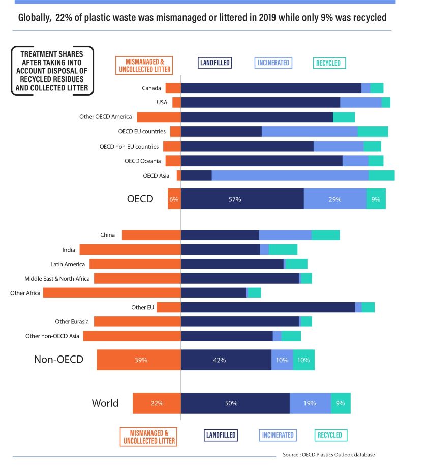 About 19% of plastic waste is incinerated, and as much as 50% winds up in landfills. Another 22% does not enter formal waste management systems but instead goes to uncontrolled landfills, is burned in the open, or ends up scattered in land or water. It is estimated that there are about 30 million tons of plastic waste in the seas and oceans, while 109 million tons have accumulated in rivers. Plastic pollution is also growing due to faulty waste management and recycling practices, states the OECD report.