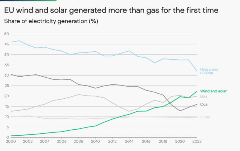 The share of wind and solar electricity production reached 22% in the European Union last year, surpassing fossil gas for the first time, Ember said in its latest report. Despite the gas crisis and record low levels of nuclear and hydropower production, the EU has prevented the threat of a return to coal power, the independent energy think tank said.