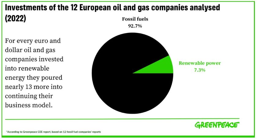 Moreover, a mere 7.3% of the investments made by these twelve companies in 2022 were allocated to green energy, amounting to EUR 6.57 billion. In contrast, 92.7%, or EUR 81.5 billion, were spent on fossil fuel projects, and even the expansion of the fossil fuel business, said Greenpeace.