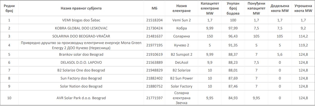 Investitori su, kako je navelo Ministarstvo, ponudili cenu od 50,9 evra do 58 evra po MWh, a limit je bio 72 evra. Premije su dobile sledeće firme: Vemi biogas, Kobra global, Solarina, Mona Green Energy 2 i Brankov solar. Solarina je jedini veći projekat, snage 150 MW, a Brankov solar predstavlja projekat za agrosolar.