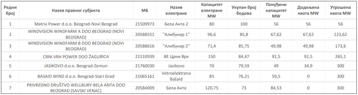 Premije su dobile sledeće firme: Matrix Power, čiji je vlasnik francuski Akuo Energy, Windvision Windfarm A, Windvision Windfarm B, Crni Vrh Power, čiji su vlasnici kineske firme Shanghai Electric Power & Energy Development Limited i CMC Capital, i Jasikovo, čije vlasništvo drže fizička lica iz Srbije.
