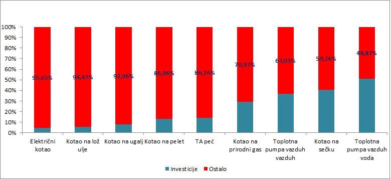 Specifična težina vrednosti investicionog ulaganja na LCoH u procentima, kod individualnog načina grejanja prikazan je na slici 3.