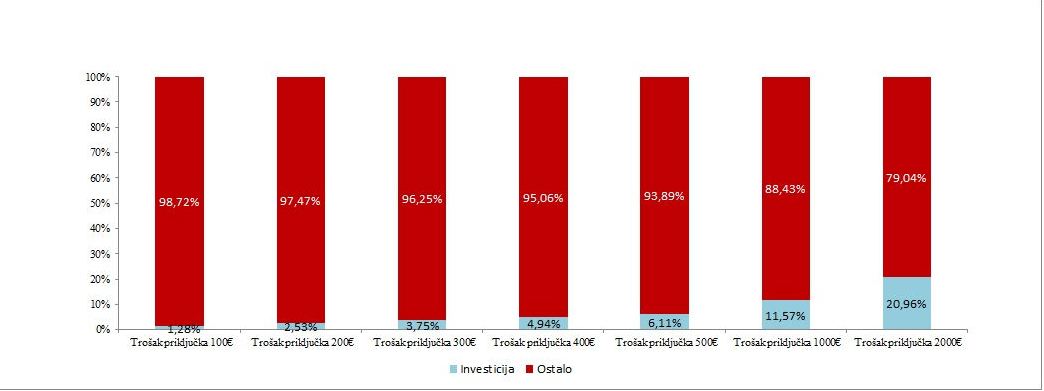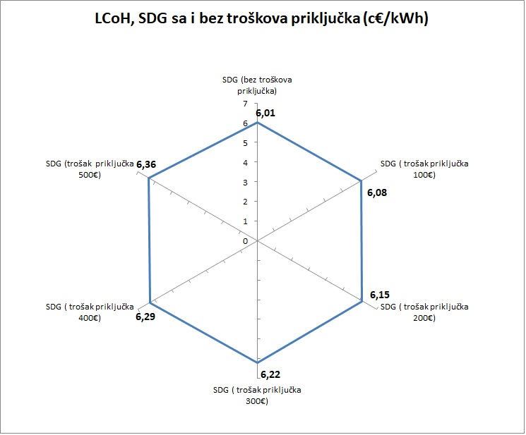 Razlika LCoH usled promena troškova priključenja od 0 do 500 evra za dva ekstremna slučaja iznosi 5,5% (slika 4.).