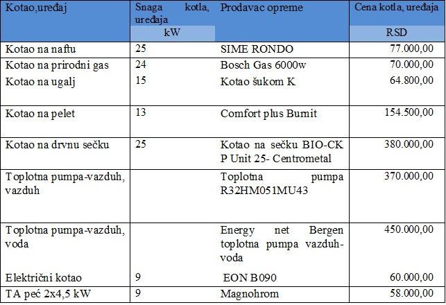 Vrednosti za investicione troškove u slučaju individualnog grejanja uzeti su na osnovu troškova kotlova, odnosno uređaja na tržištu Republike Srbije. Prilikom izbora kotla, uređaja (tabela 2.), može se uočiti da su njihove snage veće od potrebnih. Naime, ove vrednosti nisu izabrane kako bi se investicioni troškovi kotlova i uređaja za različite energente „veštački“ učinili višim, već zato što na tržištu Srbije u ponudi nema kotlova i uređaja manjih snaga, a otvoreno je pitanje da li bi troškovi nabavke tih kotlova i uređaja bili znatno niži i promenili odnose vrednosti LCoH.