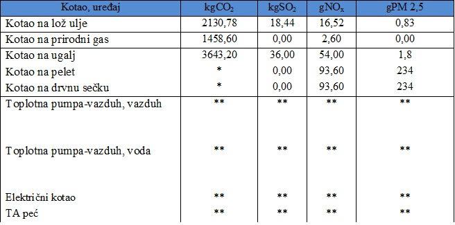 Potrebno je imati u vidu posledice korišćenja električne energije za kotlove i uređaje na električnu energiju, jer se ona proizvodi iz uglja, pa to povlači ekološke posledice, a tu je i neminovan rast cena ove vrste energije. Za razmatranu količinu proizvedene toplotne energije (tabela 3.), prikazane su emisije CO2, SO2, NOx i PM 2,5.