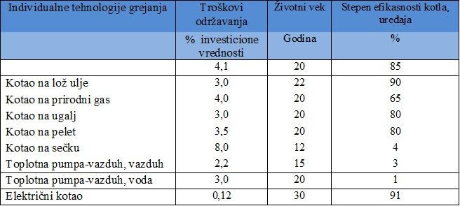 Uzimajući u obzir da konačni rezultat značajno zavisi od vrednosti troškova održavanja, koji su sastavni deo operativnih troškova i životnog veka kotlova i uređaja, korišćeni su podaci Danske agencije za energetiku za opremu kod individualnog grejanja (korigovane su vrednosti životnog veka kod toplotne pumpe vazduh-vazduh sa 10 na 12 godina i troškova održavanja sa 10,84% na 8% i troškovi održavanja električnog kotla sa 4,77% na 3%), (tabela 2.).