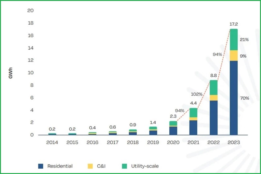 Godišnje instalacije baterija su do 2018. i 2019. bile zanemarljive, ali od tada beleže vrtoglav rast. Sa oko tri gigavata u ove dve godine dostigle su 41,5 GW u 2023.