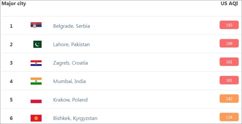 U prestonici Srbije je u nedelju na ponedeljak u jednom trenutku očitano 193 poena, što je u opsegu od šest kategorija kvalitet vazduha svrstalo u nezdrav i označava se crvenom bojom. Beograd je tada ubedljivo vodio, jer je drugoplasirani Lahor u Pakistanu imao čak 24 poena manje. Pokazatelj US AQI već iznad 200 postaje ljubičast, a vazduh se u tom slučaju smatra vrlo nezdravim. Kada se izmeri više od 300 poena, boja je kestenjasta i vazduh je opasan.