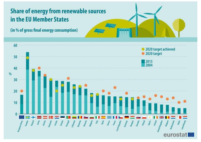 Na suprotnom kraju su Luksemburg i Malta, koji su pokrili samo 5 odsto potrošnje energijom iz obnovljivih izvora, zatim Holandija (5,8), Belgija (7,9) i Ujedinjeno Kraljevstvo (8,2).