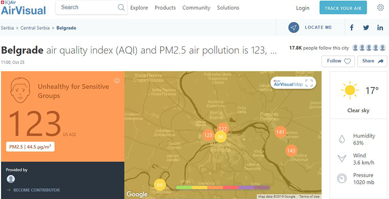 Imajući u vidu ove podatke ne iznenađuje što je AirVisual, sajt i aplikacija za kvalitet vazduha širom planete, u nedelju, 20. oktobra, Beogradu dodelio titulu grada sa najlošijim kvalitetom vazduha u svetu. Ispred brojnih indijskih, pakistanskih, kineskih, vijetnamskih, i poljskih gradova. Sarajevo je redovan „gost“ ove rang-liste, kao i Sofija i Skoplje, ako se pogledaju zemlje regiona. Danas, oko podneva, vazduh u Beogradu, Sarajevu, Skoplju i Sofiji, prema podacima AirVisual, bio je opasan za osetljive kategorije stanovništva, pa su ovi gradovi bili među 20-ak u svetu koji imaju najlošiji kvalitet vazduha.