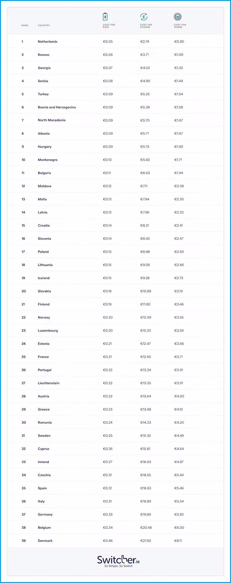 Najskuplje zemlje za punjenje vozila na struju su bogatije evropske zemlje sa mogo večim brojem ovih četvorotočkaša u poređenju sa centralnom i jugoistočnom Evropom. Izuzetak su samo Kipar i Češka.