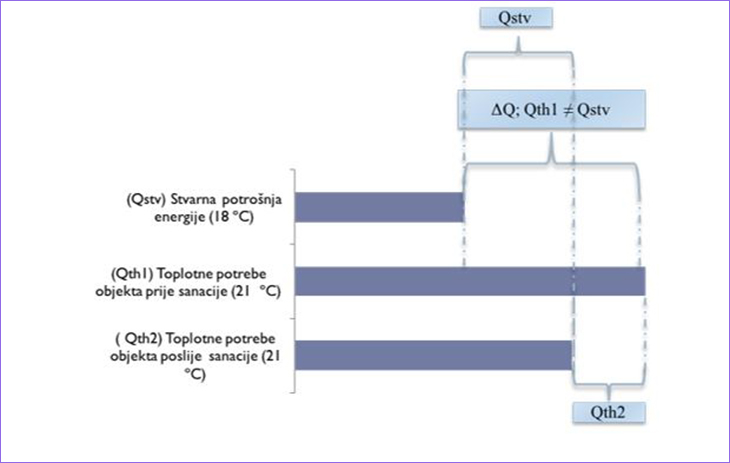 Dijagram jasno ocrtava da se pri uslovima prije sanacije zgrade, termalni komfor ne ostvaruju, odnosno da prosječna temperatura unutar objekta iznosi 18°C. Kako bi se definisale uštede nakon implementaacije EE mjera, pretpostavlja se da je komfor zadovoljen, odnosno da temperatura unutrašnjeg prostora iznosi 21°C. S istom pretpostavkom se ulazi u analizu i nakon što se implementiraju EE mjere. Međutim, javlja se anomalija da se i nakon implementacije EE mjera troši ista ili veća količina energije (rebound efekt). To govori da uštede nisu postignute, ali da se zadovoljio termalni komfor, da je zgradi produžen vijek trajanja, da se unaprijedilo socijalno, a često i zdravstveno, stanje korisnika. Naravno, ovo nije slučaj za svaku zgradu, ali je izazov koji se javlja često u BiH.
