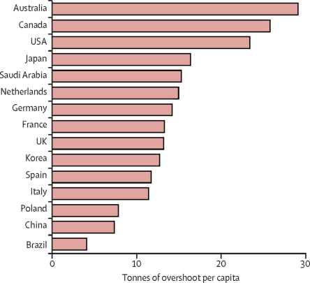 Australija je prva na svetu u prekomernoj upotrebi resursa sa 29,16 tona po glavi stanovnika, a slede Kanada sa 25,82 i SAD sa 23,45 tona per kapita.