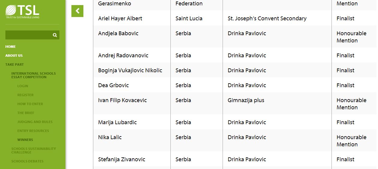 Drndarski, profesorka biologije u O.Š. Drinka Pavlović, već četvrtu godinu za redom podstiče učenike da učestvuju u ovom globalnom takmičenju koje organizuje dobrotvorna organizacija Trust for Sustainable Living (TSL), svake godine sa sve većim uspehom i zapaženijim rezultatima. Devetoro finalista i dobitnika specijalnih priznanja iz Srbije ove godine su se probili u konkurenciji 1.470 dece iz 53 zemlje, kaže Drndarski.
