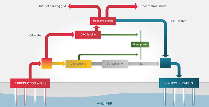 Gasovi će se odvajati od vode i sagorevati u gasnom motoru, a 98% CO2 iz sagorevanja i onog koji prati toplu vodu, se prikuplja i ponovo ubrizgava u izdan (aquifer), gde i ostaje. U konvencionalnim geotermalnim elektranama ovi gasovi predstavljaju otpad i zagađenje za okolinu.