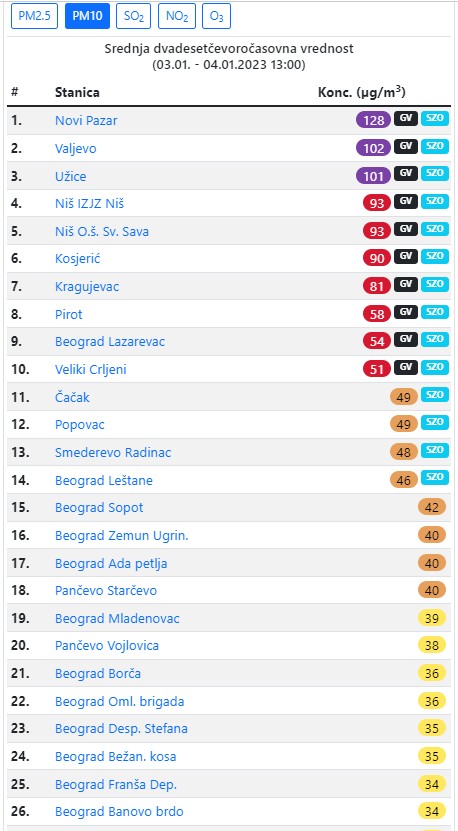 Trenutno je po 24-satnim vrednostima najzagađenije u Novom Pazaru, Valjevu i Užicu, koji su u ljubičastom. Kvalitet vazduha je loš u očitavanjima na sedam mesta, a srednji na osam. Ako se gledaju klizni srednji 24-satni nivoi čestica PM2.5, koje su manje od 2,5 mikrometra, Novi Pazar, Užice, Niš, Kosjerić i Valjevo su označeni smeđim, što znači da je kvalitet vazduha izuzetno loš.