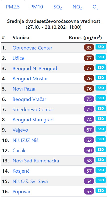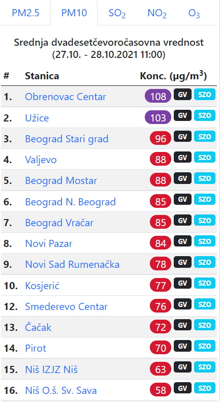 Sticajem okolnosti, domaće i EU zakonodavstvo ne prepoznaje satne vrednosti kao opredeljujuće u smislu ocene kvaliteta vazduha već se za tu potrebu koriste srednje 24-časovne vrednosti. Što je još zanimljivije, ističe Lekić, ove dnevne, izrračunate veličine, sem zakonodavstva prepoznaje i Svetska zdravstvena organizacija, pa tako prema najnovijim preporukama iz septembra 2021. godine perporučuje graničnu vrednost od 15 µg/m3 za PM2.5 odnosno 45 µg/m3 za PM10 kao ciljane vrednosti za 24-časovni prosek.