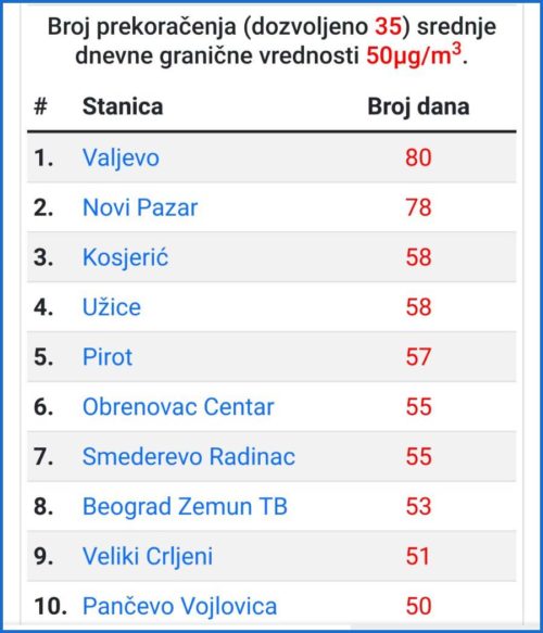 Pokazatelji zagađenosti opasnom mikroskopskom prašinom tipa PM10 upozoravaju na stanje kvaliteta vazduha u Srbiji. Tek se završava prvi kvartal, a u većini gradova u kojima se meri stanje kvaliteta vazduha već su premašeni limiti za jednu kalendarsku godinu propisani Zakonom o zaštiti vazduha. U broju dana sa prekoračenjem trenutno prednjače Valjevo i Novi Pazar, sa 80 odnosno 78 dana.