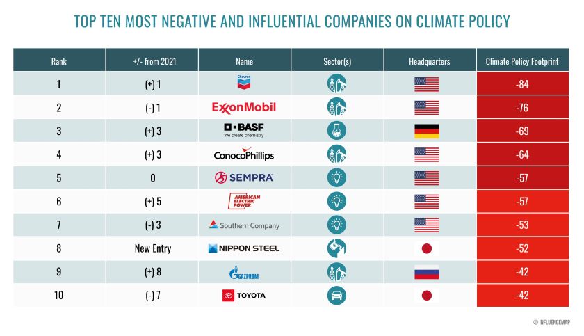 Kompanije za fosilna goriva sa sedištem u SAD dominiraju na globalnoj listi preduzeća koja su najviše opstruisala angažovanja u klimatskim politikama i u borbi protiv klimatskih promena tokom 2022. Prva dva mesta zauzimaju naftaši Chevron i ExxonMobil, dok je na trećem nemački hemijski gigant BASF.