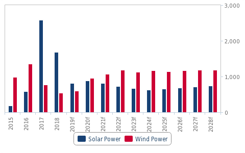 - We forecast wind and solar capacity additions growth in Turkey to slow over 2019/2020, as a number of projects will face delays amid the country’s challenging economic environment. In particular, the depreciation in the lira from August 2018, and the ensuing volatility registered for the currency, will mean that obtaining financing will be challenging for a number of developers