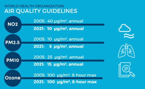 WHO, after a systematic review of the accumulated evidence, recommends lower values for several pollutants, most notably for particulate matter PM2.5, which causes the greatest health burden, for which a new annual concentration of 5 µg/m³ is now recommended (the current EU’s annual standard is 25µg/m³); for nitrogen dioxide (NO2), which has come under intense scrutiny in discussions on road transport and inner-city driving bans, a new annual concentration of 10 µg/m³ is now recommended (from previously 40 µg/m³).
